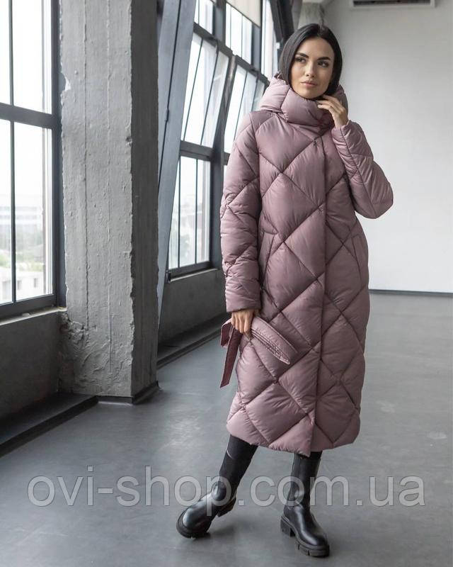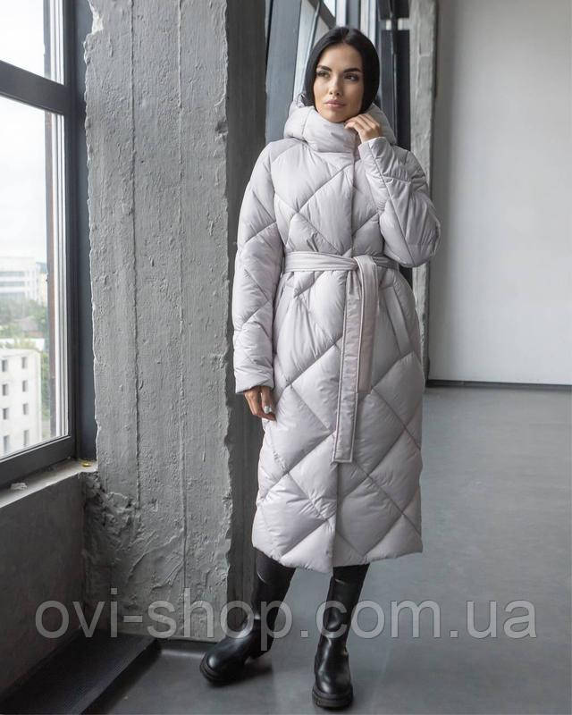 Зимовий стьобаний пуховик з капюшоном і поясом в комплекті.