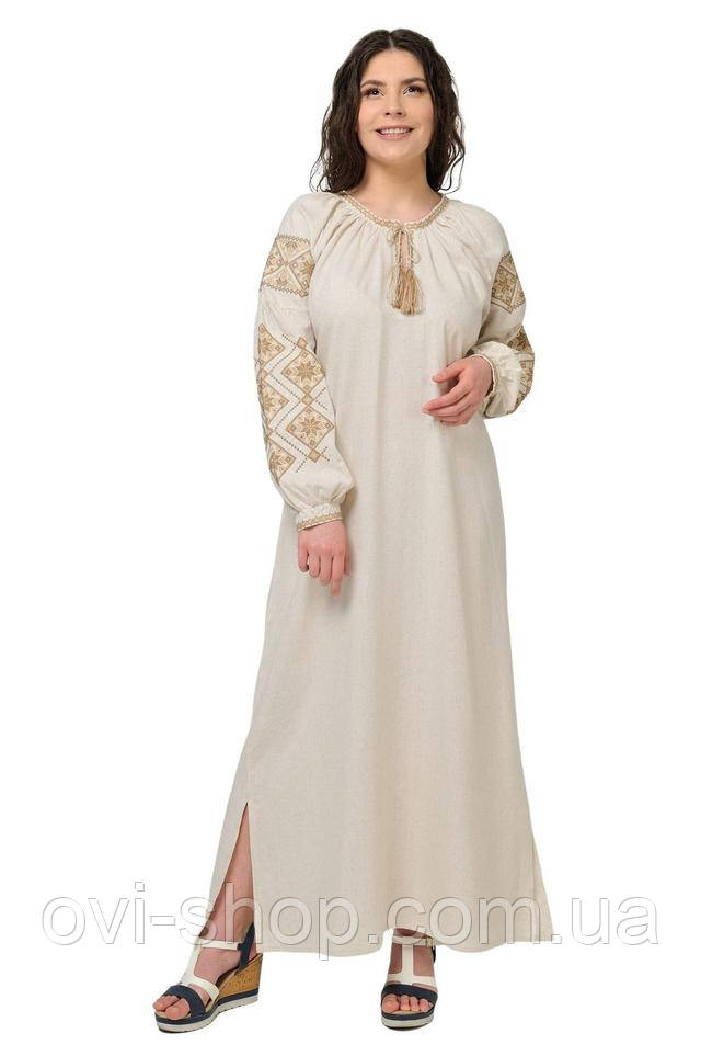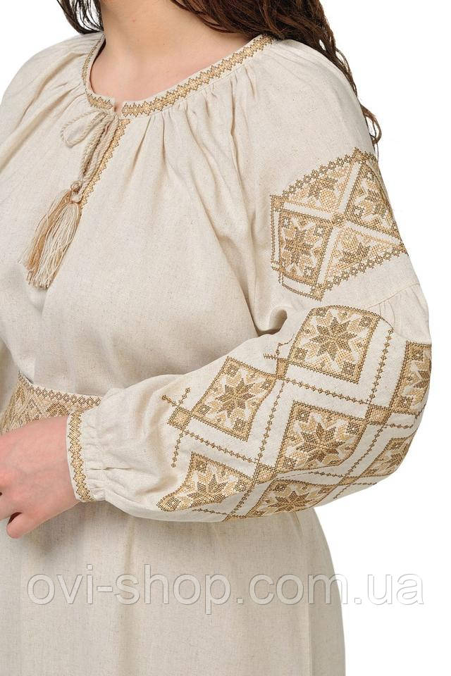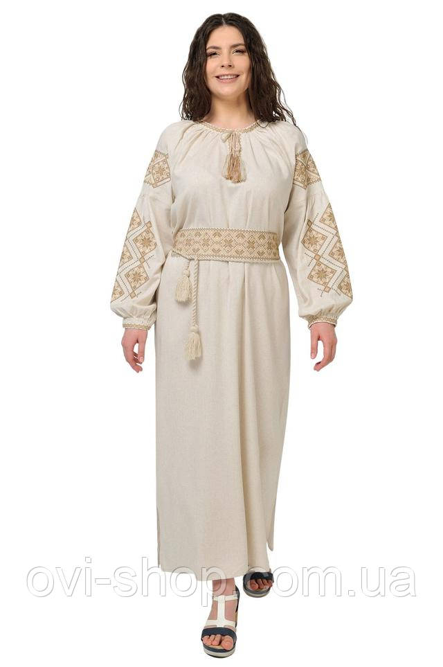 Традиційна українська сукня вишиванка з поясом. Модель «Соломія» пошита із сорочкового льону «жатки». Сукня має трапецієподібний вільний силует з невеликими бічними розрізами.