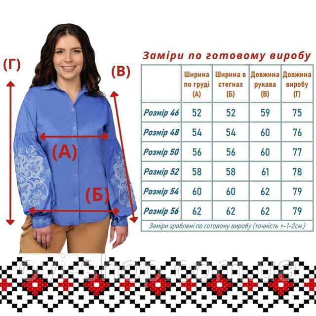 Ворота, рукави та манжети прикрашені машинною вишивкою. Використовується лише якісна фірмова вишивальна нитка.