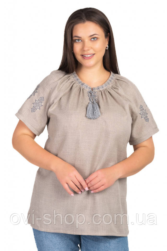 Жіноча блуза у стилі сучасної вишиванки — поєднання комфорту, ніжності та українських традицій. Виготовлена з натуральної легкої тканини, приємної до тіла. Має вільний крій, короткі рукави та декоративну вишивку на плечах і горловині. Збірка біля вирізу та китичка додають образу жіночності та шарму.