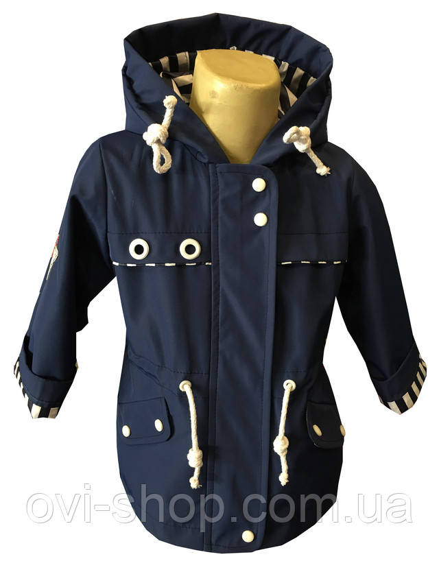 Внутрішня частина капюшона, манжетів і деякі елементи пошиті з плащової тканини в синьо-білу смужку.
